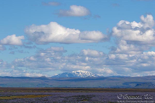 We boarded the ferry shortly. From the deck of the ferry, looking back toward the mainland, we had a nice view of the lupine-covered field and distant glacier-covered mountains. I believe the high peak in the distance is Hekla, one of Iceland's most active volcanoes.