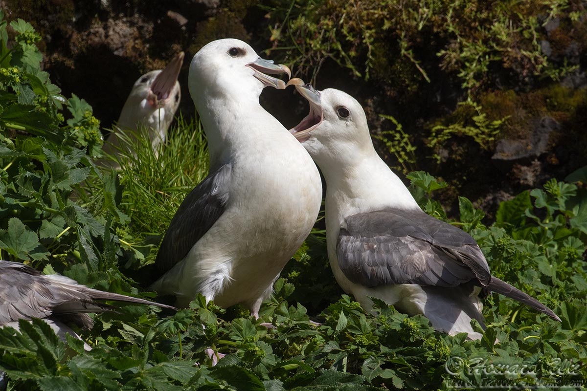 Here I also got close views of two birds (two species of birds) which I had seen on this trip but until then only distant views. One was an Eurasian Oystercatcher that actually walked about in the gravel parking lot. Another is the Northern Fulmar. There were hundreds of them nesting on the cliff around the waterfall. I saw some pairs with displays of affection in the nest.