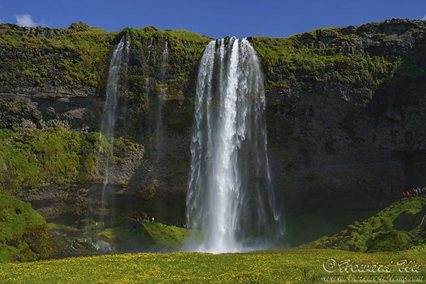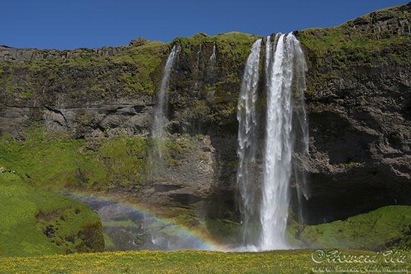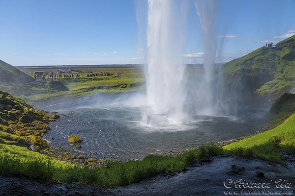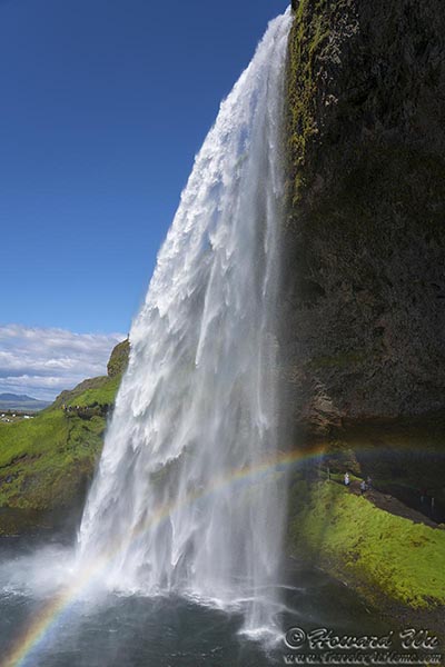 One of the special things about Seljalandsfoss is that one can walk behind the waterfall. And when the sunlight is in the right direction, rainbows appear. We walked a round behind the waterfall. It's easy to get a drenching from the spray of water, and I had to hurriedly snap some pictures on the slippery path.
