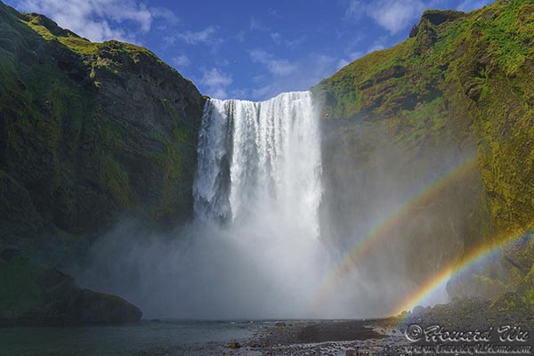 Our next stop was at Skogafoss, another spectacular water on the southern coast. The massive waterfall tumbles down a sheer cliff, it has the reputation of consistently produces a single or double rainbow. This reputation was clearly intact at the time of our visit.