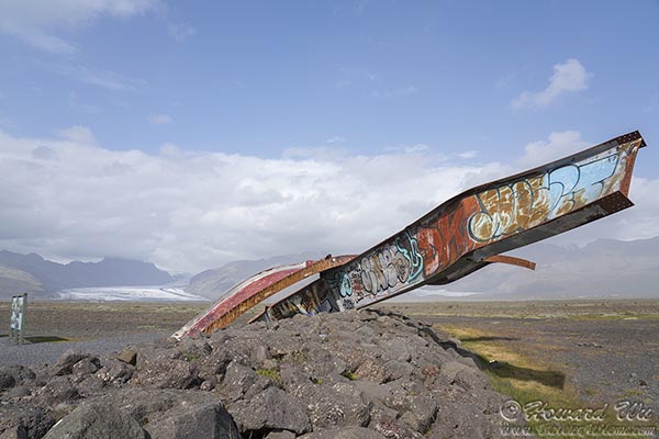 We arrived at the Skeidara Bridge Menument, the remnants of a bridge that was destroyed in a massive flood after the eruption of the Vatnajokull volcano in 1996. The Skeidararjokull glacier, whose melt caused the flood, can be seen through the dust not far from this spot.