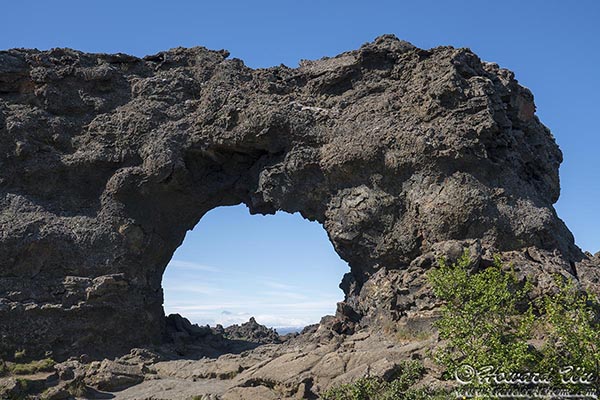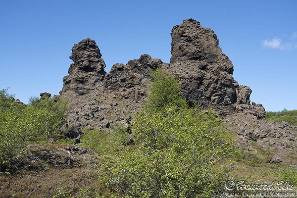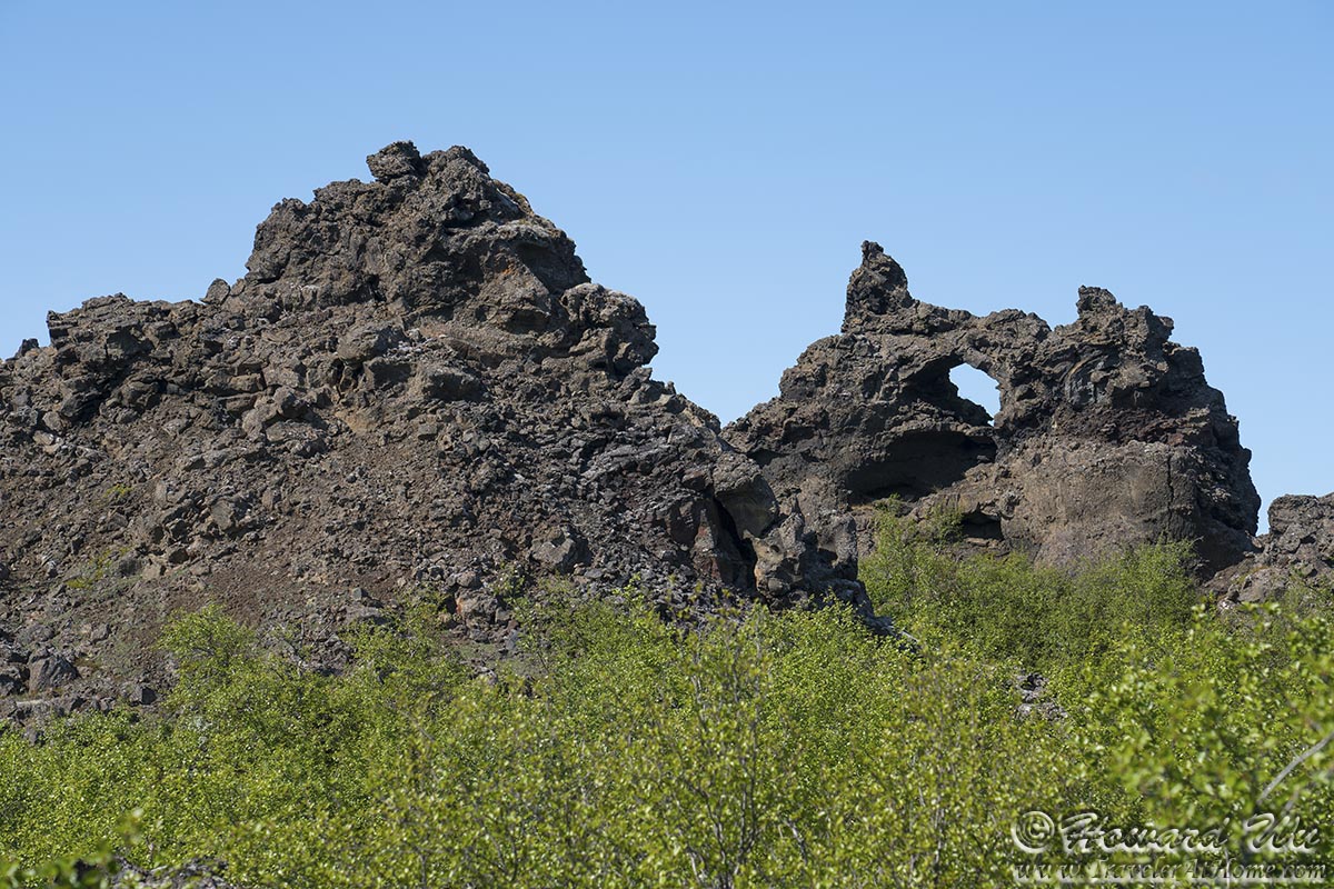Dimmuborgir is a lava field with strangely (some say grotesquely) shaped rock formations. Some rocks have been eroded and formed grotos and arches. We hiked in the rock "forest" for a little bit.