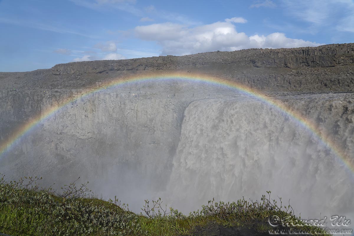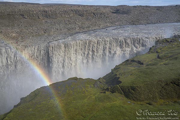 We retracted and went to Dettifoss, said to be the most powerful waterfall in Europe. One can access the waterfall from either the east or west side. Because we went in the afternoon, I picked the west side when the sun would be behind us. This worked out beautifully -- a beautiful rainbow appeared over the thunderous waterfall.