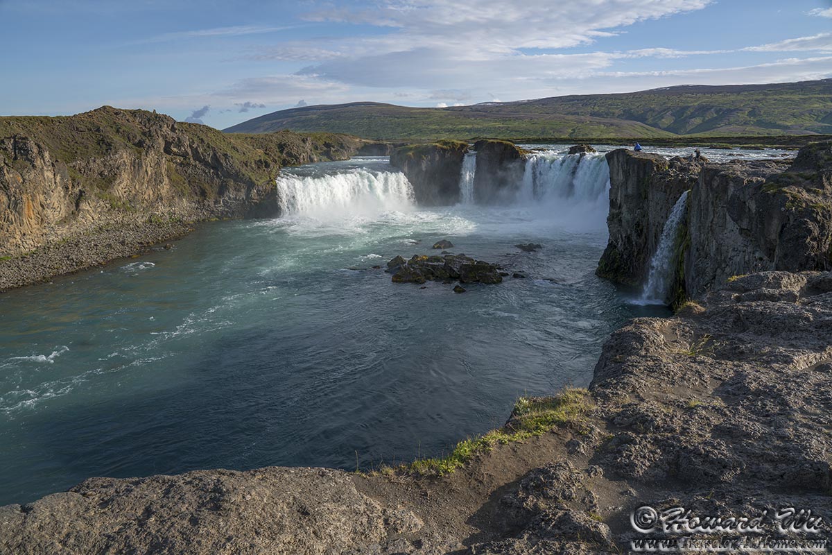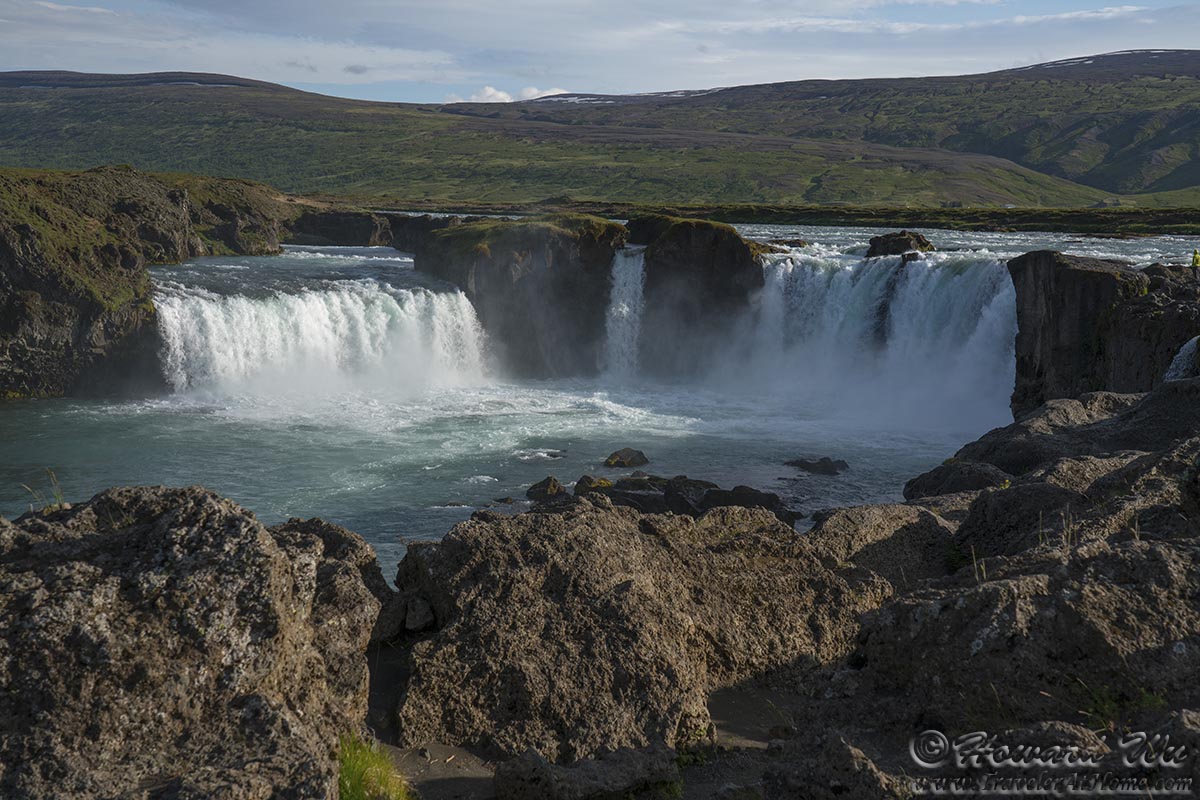 We had to push on to Akureyri. But we could not resist stopping at Godafoss. Not as powerful as some other waterfalls in Iceland, Godafoss is roughly symetrical, tumbling down a horseshoe-shaped cliff, and has a beauty of its own.