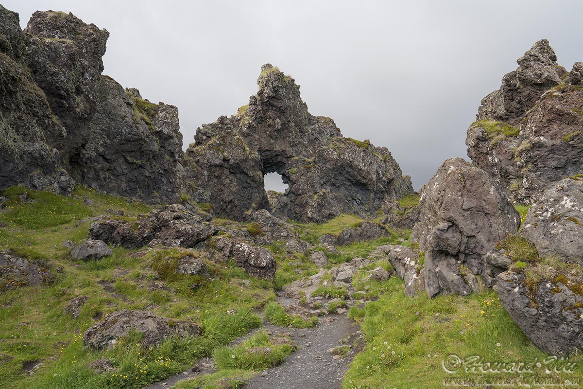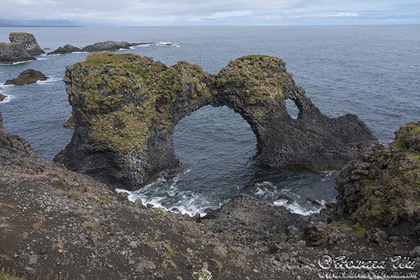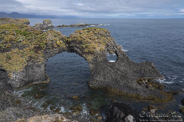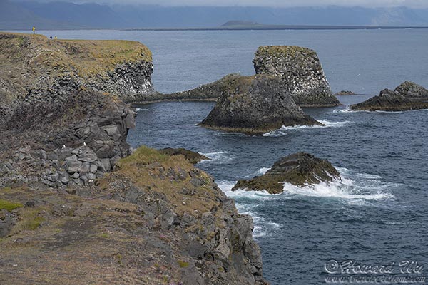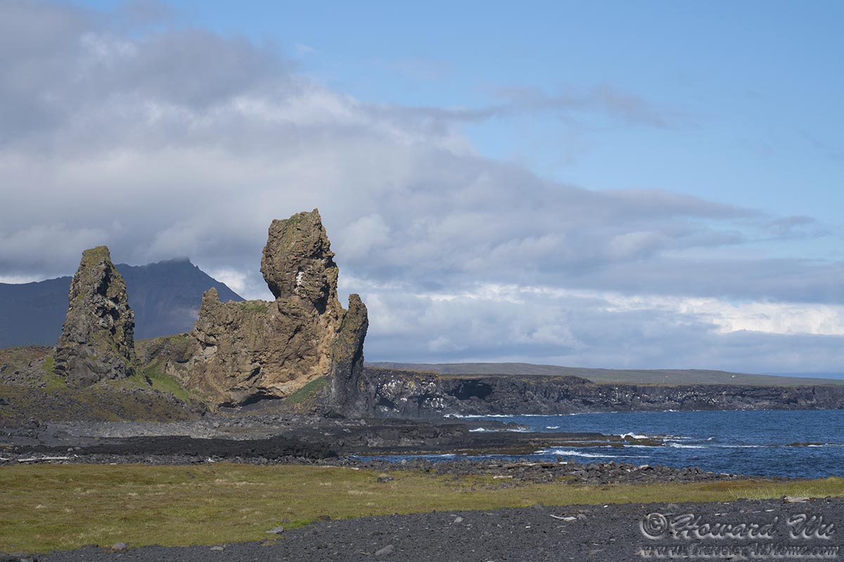 It was cloudy alright, but as we neared the coast at the western end of the peninsula, the sky cleared. We stopped at a parking lot off the highway. This turned out to be the village of Arnarstapi, near the viewpoint of Gatklettur ("Hellnar Arch"). As we walked along the coast, the sky brightened up even more, the view became more and more beautiful!
