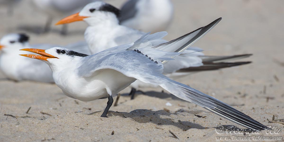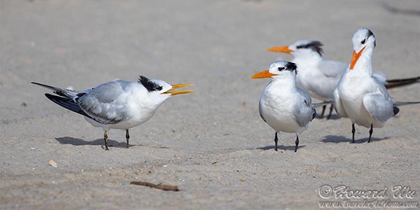 On the Atlantic seashore of Assateague Island, a group of Royal Terns were resting. Apparently this year's young had fully fledged, but they seemed to still beg their parents for easy meals.