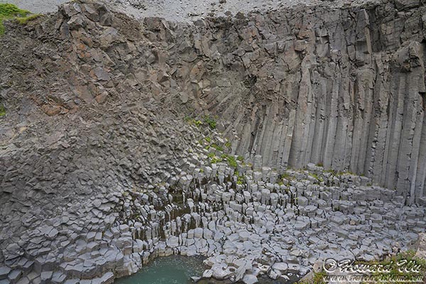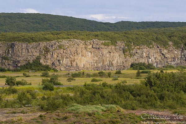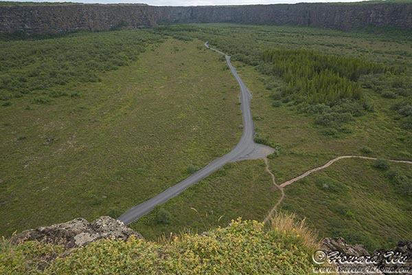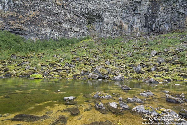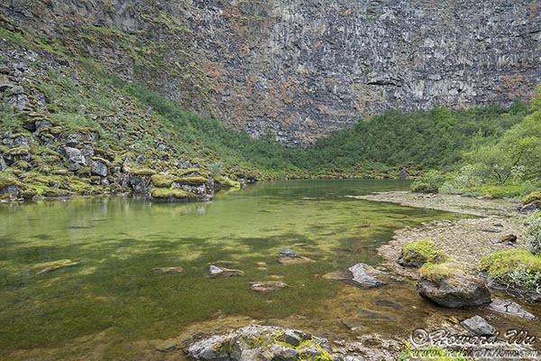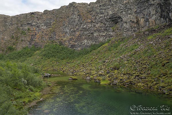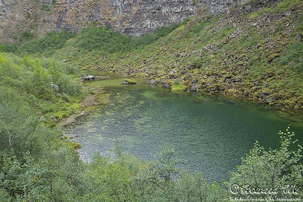 Asbyrgi is a horseshoe shaped canyon. At the "tip" of the horseshoe is a small limpid body of water, Botnstjorn Pond. We drove to the trailhead and hiked to the pond. Weather was not great at this time (too cloudy), but the canyon is lush with trees and other plants, a strong contrast to other part of Iceland which are spectacular but often austere. Surrounded by high basalt cliffs, the pond seems like a sanctuary.