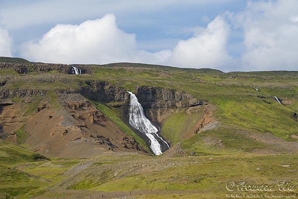 After our hike in Asbyrgi Canyon, we still had a long drive to our destination of the day, Egilsstadir. We had to zoom by Dettifoss, one of Europe's most powerful waterfalls, without stopping. We could afford to do so because we had seen it two years ago. We managed to make a stop at Rjukandafoss just before reaching Egilsstadir.