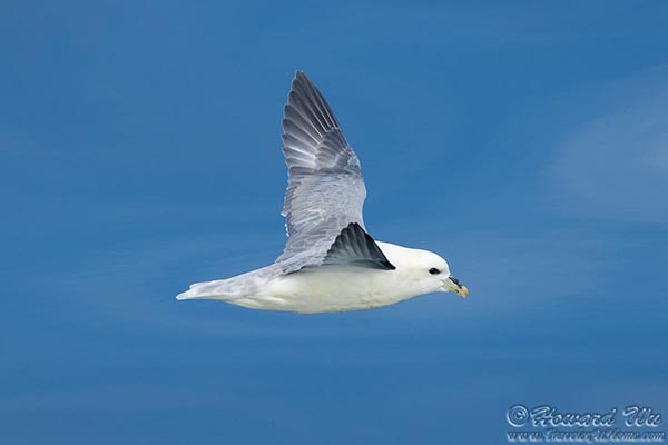 Numerous seabirds were fishing in the water or flying around, such as this Northern Fulmar.