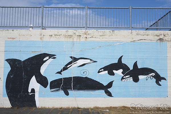 Húsavík is known as "the whale watching capital of Europe", and there were many whale-watching tours at the harbor. They also had a mural which made sure visitors won't forget about this (but of course someone had to vandalize it).