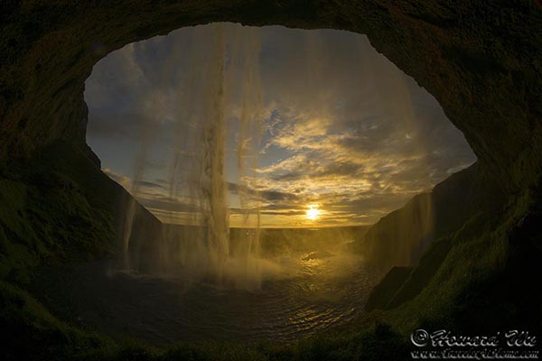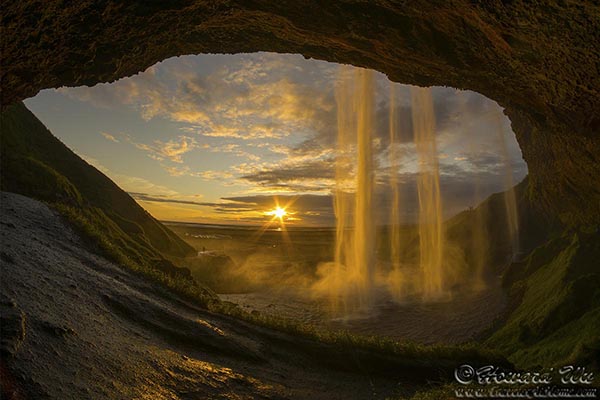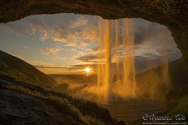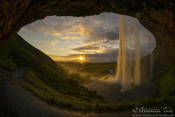 We then headed to Seljalandsfoss, which we did visit in 2019, but we did not have time to visit for the sunset (in fact, the sun barely set at that time, it being near the Summer Solstice). This time, we atoned for our missed opportunities, and I walked behind the waterfall and waited until the sun sank low on the western horizon.