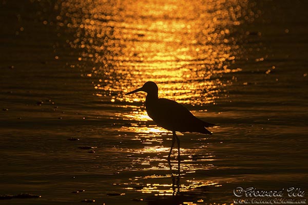 A Willet silhouetted against the glistening reflection of the sunrise.