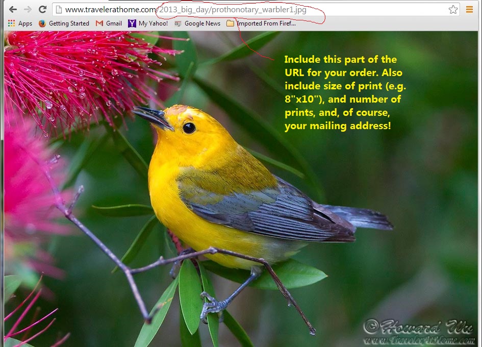 - Visit my website and note down the file name(s) of the image(s) - you can do this by clicking on the image, this will bring up another window/tab with a medium-res image (usually 1200x800), note the the part of the URL for each image after the domain (http://www.travelerathome.com) to identify each image you wish to order, this is typically something like: 2013_big_day/prothonotary_warbler1.jpg. An illustration can be seen here.